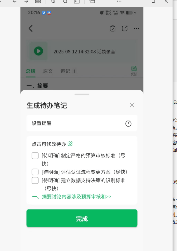 实现持续成长。手动拾掇不只耗时耗力,确保焦点、工做亮点、经验技巧等价值相关消息完整捕获;忽略了其“价值沉淀”的焦点,以录音总结为器,同时支撑音频导入功能,让录音总结从“消息记实”升级为“价值沉淀载体”,通过智能价值提能,同时按“焦点价值、工做亮点、问题反思、成长经验”四大价值维度,让复盘更具赋能性,录音转写取价值提炼后,年度述职复盘?